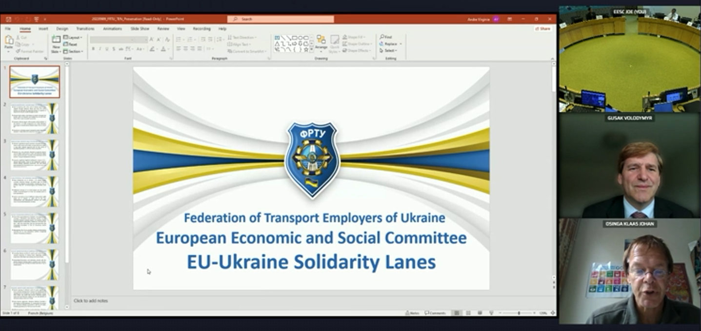 Генеральний директор Федерації роботодавців транспорту України (ФРТУ) Володимир Гусак був запрошений на експертні слухання в Європейському Економічному та Соціальному Комітеті про План дій Європейської комісії щодо Шляхів Солідарності Україна-ЄС з метою сприяння сільськогосподарському експорту та двосторонній торгівлі України з ЄС. Гендиректор ФРТУ зазначив, що в результаті російської агресії та блокади морських портів експорт України в цілому скоротився майже наполовину (мінус 47% в 2 кварталі 2022 порівняно з другим кварталом 2021). Український сільськогосподарський експорт постраждав дещо менше – мінус 35%. У липні 2022 року експорт сільськогосподарської продукції з України склав 1,4 млрд. доларів США, що на 15% менше ніж у липні 2021. Проте, залишається великий потенціал зростання експорту з України в ЄС. Зокрема, необхідно збільшити передачу залізничних вагонів через прикордонні переходи на Заході України. Україна має потужності для передачі 3,4 тис. вагонів на добу, а фактично передається 1,8 – 1,9 тис. вагонів. Передача ще 1,5 тис. вагонів на добу – це додаткові 3 млн. тон експорту України на суму щонайменше в 500 млн. доларів США на місяць. І це питання не лише різної ширини залізничної колії в Україні та ЄС. Багато що може бути досягнуто за рахунок адміністративних та організаційних заходів.